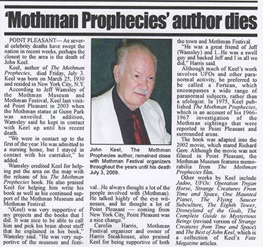 His 1975 book, The Mothman Prophecies was Keel's account of his investigation into alleged sightings in Point Pleasant, West Virginia of a huge, winged creature called the "Mothman."