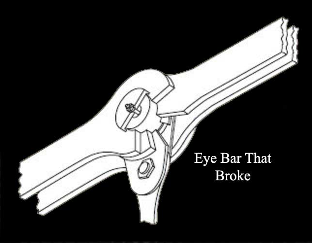 Investigation of the wreckage pointed to the cause of the collapse being the failure of a single eye-bar in a suspension chain, due to a small defect 0.1 inch (2.5 mm) deep. The bridge was carrying much heavier loads than it had originally been designed for and was poorly maintained.